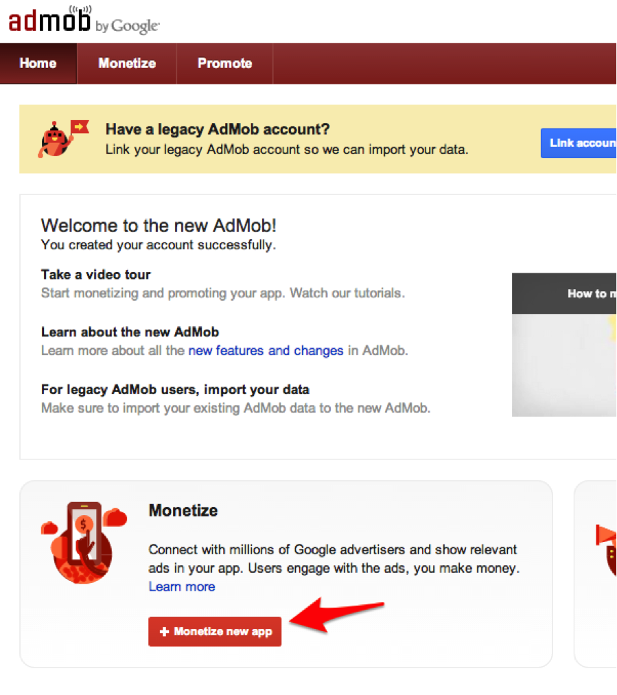 You can set up monetized banner ads within your apps using the Google Ads tab. You'll need to register for an AdMob account to start.