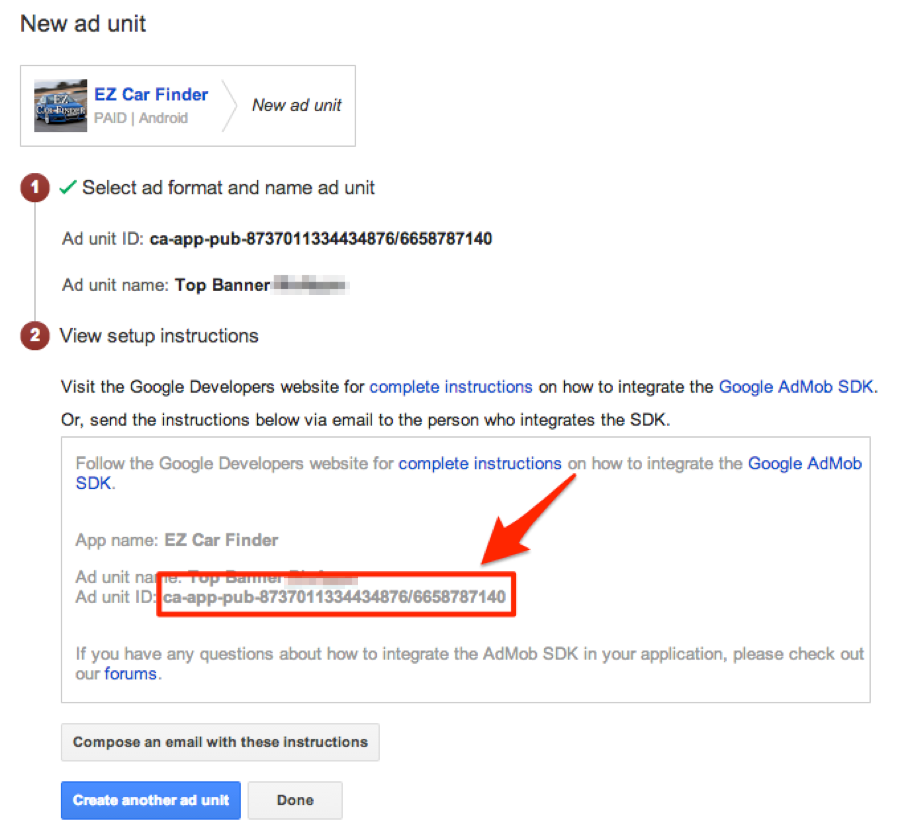 3. You'll then see the screen below, with the Ad unit ID in bold. This is the code you'll use to integrate the ads into your app.