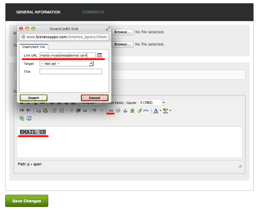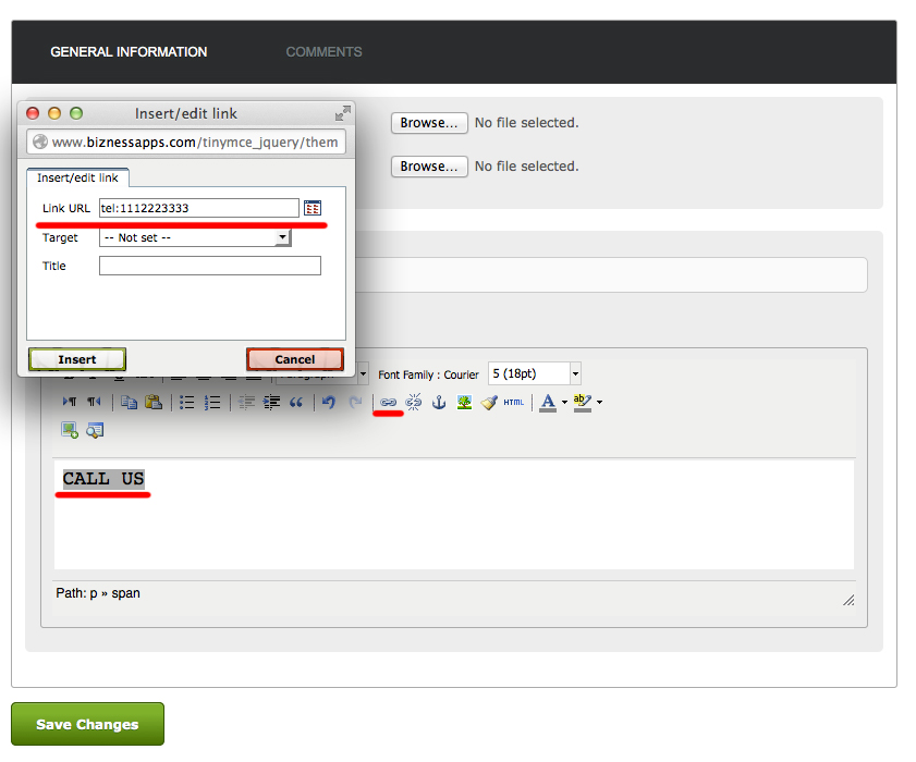 To create a Call, SMS, or Email link, simply highlight the text or image you want to create the link for, then click the hyperlink option. In the Link URL field enter: