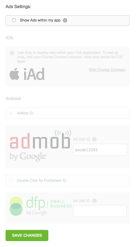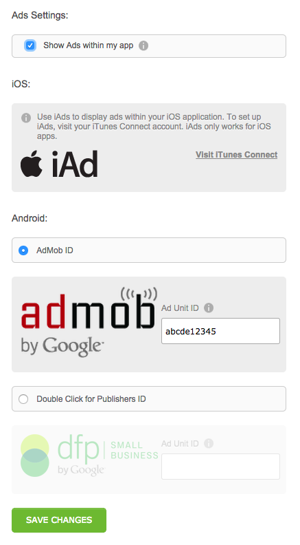 5. Next, click AdMob ID or Double Click for Publishers ID to enable an option. Plug in your Ad Unit ID, and click Save Changes at the bottom.