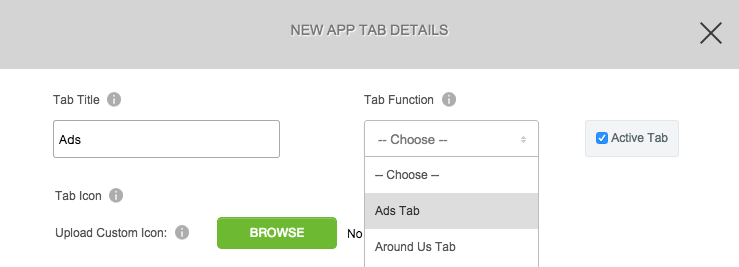 2. Create a Tab Title, select the AdsTab from the Tab Function drop-down, and choose an icon or upload your own. Save your changes. (You can change all this information later.)